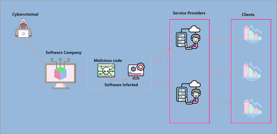 Here’s how a supply chain attack unwinds. At a Payments & Technology company office, a weak spot was spotted by a cybercriminal. And then pushing the malware into the system resulted in the information leak of millions of customers. Here’s an example of how the cyberattack is perpetrated in a supply chain attack.